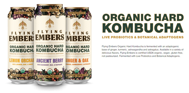 Flying Embers hard kombucha has developed low-calorie, gluten-free, vegan beverages ranging from 4.5% to 7.2% alcohol by volume (ABV), and brewed with live cultures, live probiotics, and adaptogens.